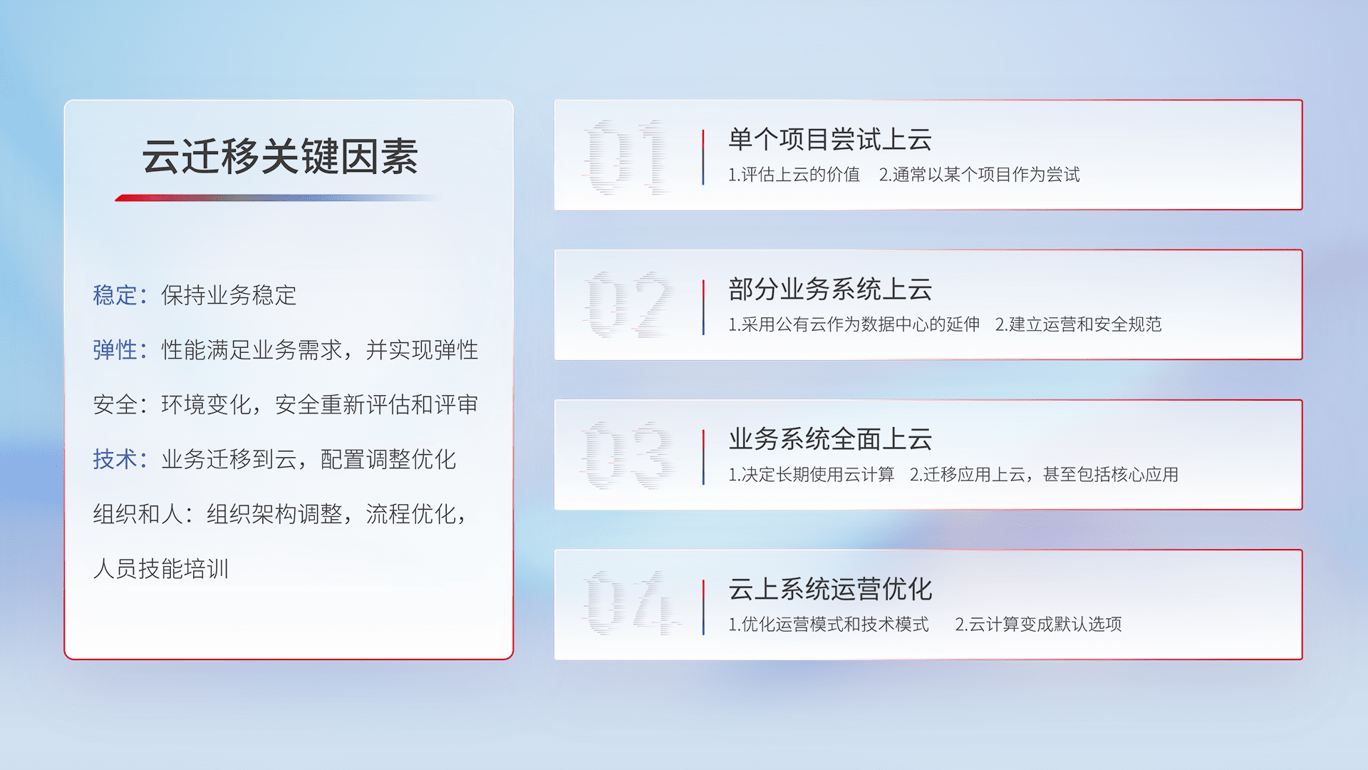 结合实际业务,,从规划设计、、、、云平台选型、、、、云原生改造、、、数据迁移、、、集成交付,,,迁移全过程为客户识别最佳上云路径,,,,做好风险识别管理,,,,设计网络架构、、、、身份权限、、、、安全审计合规、、、、操作审计、、、、日志审计、、、、监控告警策略、、多站点容灾设计等,,,对云上基础设施进行整体规划,,,,提升IT治理水平,,,以满足弹性、、高可用、、高性能的需求。。。。